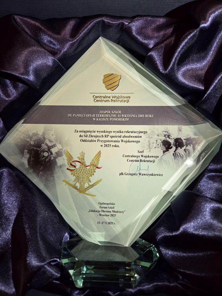 Wyróżnienie to jest wyrazem uznania dla wysokiego poziomu edukacji obronnej prowadzonej w szkole, a także zaangażowania uczniów w realizację idei służby Ojczyźnie. Nagrodę wręczył Szef Centralnego Wojskowego Centrum Rekrutacji płk Grzegorz Wawrzynkiewicz, a w imieniu szkoły odebrał ją nauczyciel przygotowania wojskowego Sylwester Burdyński, wychowawca klasy 4 OPW, w której pięciu uczniów już pełni służbę w Wojsku Polskim.