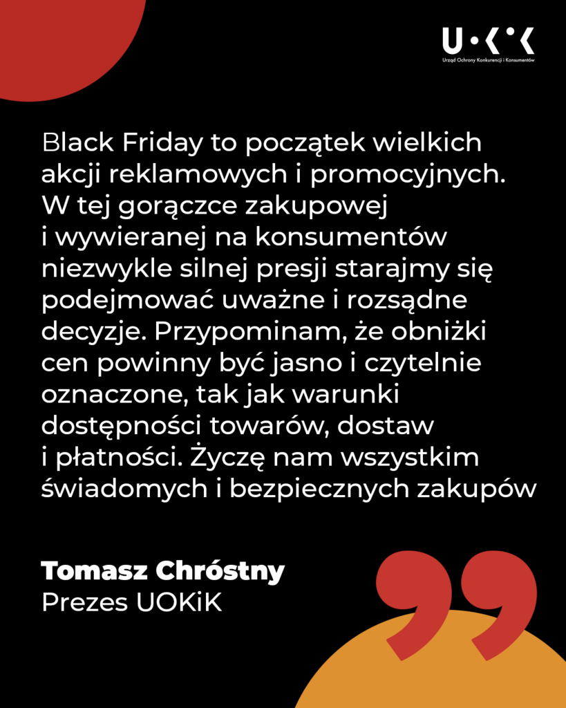 – Black Friday to początek wielkich akcji reklamowych i promocyjnych. W tej gorączce zakupowej i wywieranej na konsumentów niezwykle silnej presji, starajmy się podejmować uważne i rozsądne decyzje. Przypominam, że obniżki cen powinny być jasno i czytelnie oznaczone, tak jak warunki dostępności towarów, dostaw i płatności. Życzę nam wszystkim świadomych i bezpiecznych zakupów - mówi Prezes UOKiK Tomasz Chróstny.