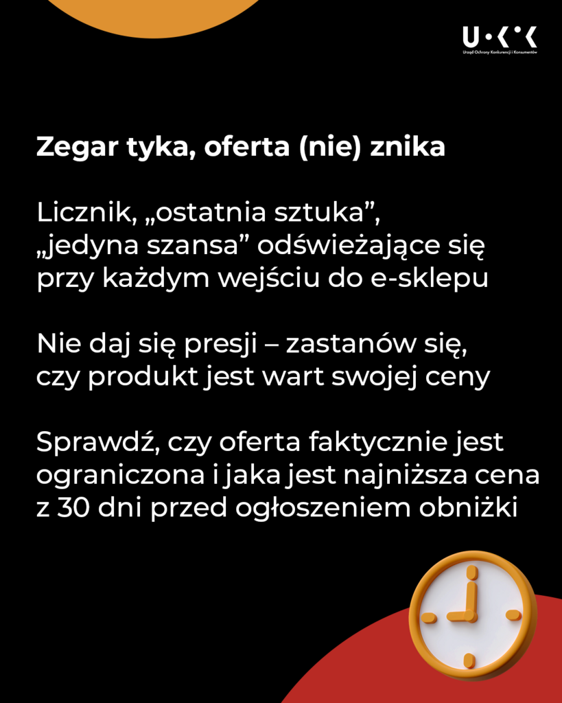 Sklepy, platformy e-commerce i influencerzy zasypują nas przekazami reklamowymi, ale to Ty decydujesz, co trafia do koszyka i za co zapłacisz. Oznaczenia „bestseller”, liczba lajków, entuzjastyczne komentarze, presja w postaci „ostatnich sztuk” i „okazji życia” mają wzbudzić Twoje emocje i zaangażowanie. Wywołać poczucie, że wszyscy kupują, że dużo stracisz, jeśli nie skorzystasz z okazji. Świadomość, że to element strategii sprzedażowej, pomaga zachować EKSTRA dystans i nie reagować automatycznie. Jak się przed tym bronić i bardziej świadomie podejmować decyzje podpowiadamy w naszym poradniku „Ty też masz wpływ!”.