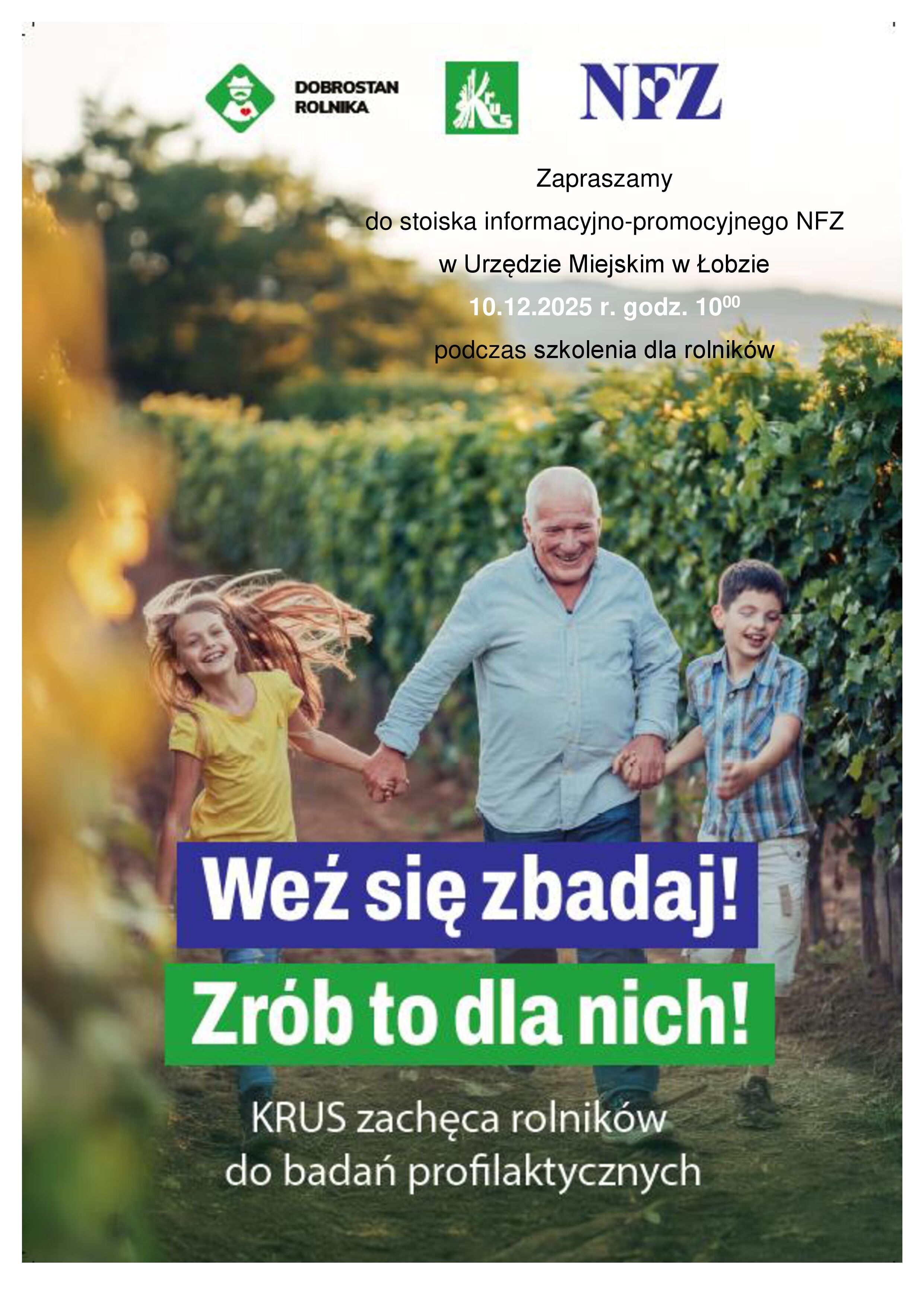 W dniu 10 grudnia 2025 r. o godz. 10.00 w imieniu Kasy Rolniczego Ubezpieczenia Społecznego (KRUS) zapraszamy rolników i ich domowników do Urzędu Miasta w Łobzie