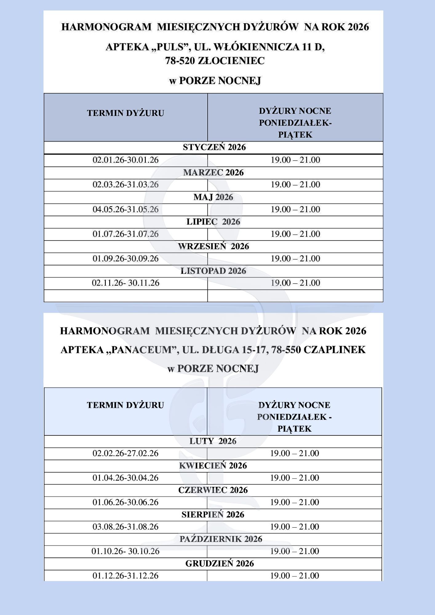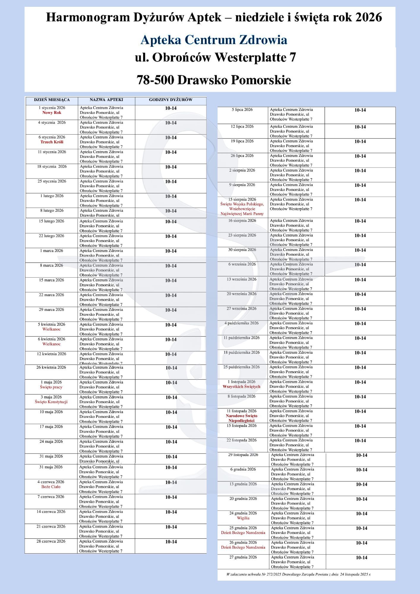 Poniżej przedstawiamy harmonogram dyżurów aptek w niedziele i święta 2026 r. w Powiecie Drawskim