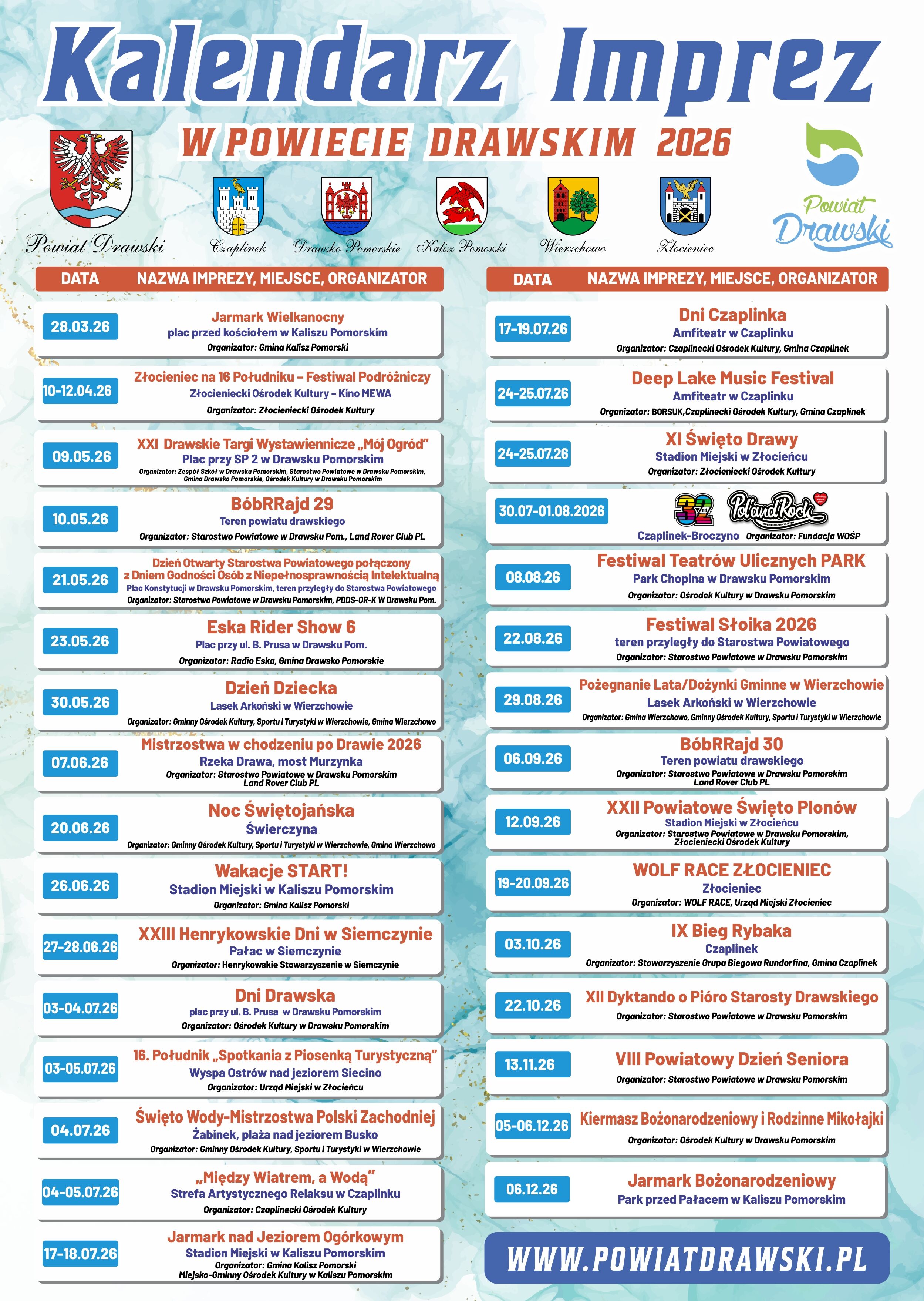 Zapraszamy Państwa do zapoznania się z zestawieniem najciekawszych wydarzeń, które odbędą się w tym roku w powiecie drawskim.