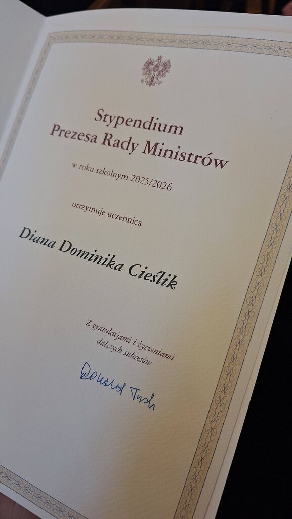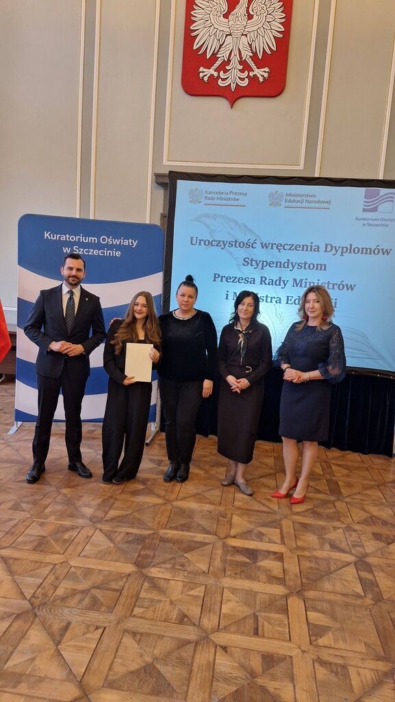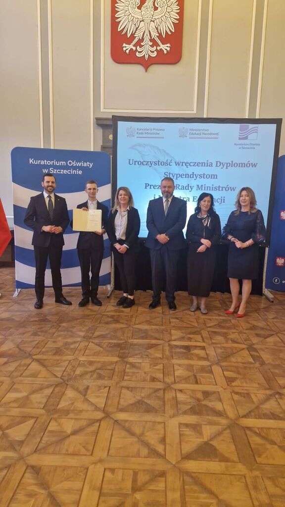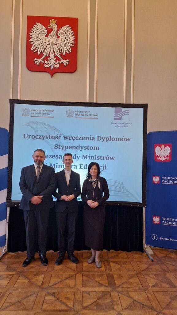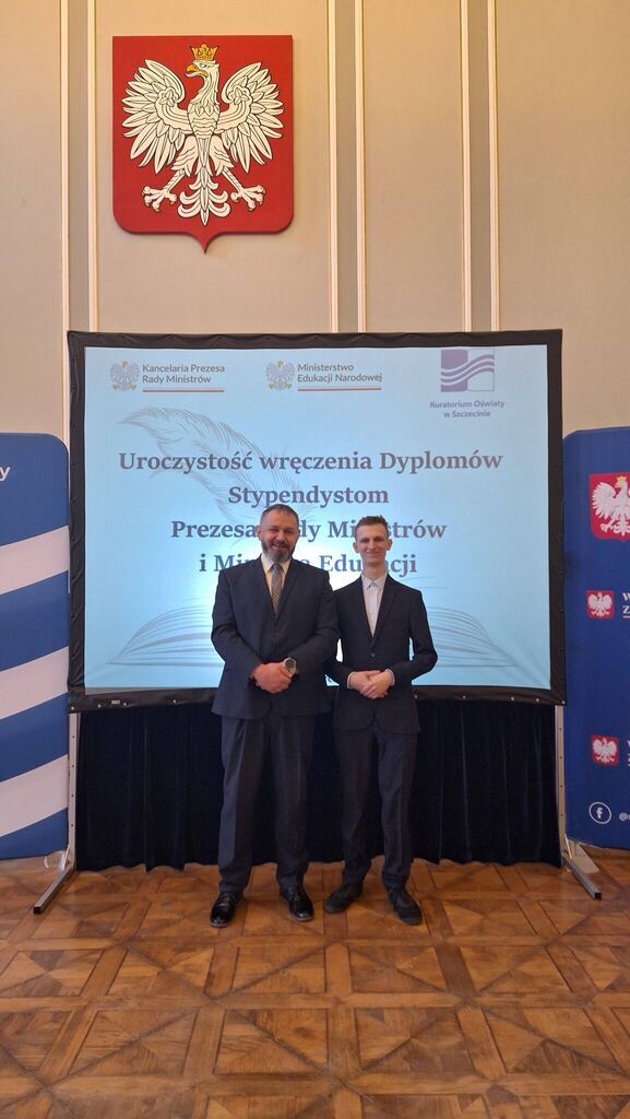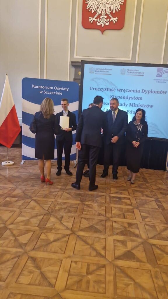 20 marca uczniowie Zespołu Szkół w Czaplinku – Diana Cieślik, uczennica Liceum Ogólnokształcącego o profilu dziennikarsko-prawnym oraz Szymon Trzciński, uczeń Technikum w zawodzie technik mechatronik wraz z Dyrektorem szkoły oraz wychowawcami Wiolettą Piotrowską i Mirosławem Staniszewskim uczestniczyli w uroczystości wręczenia dyplomów Prezesa Rady Ministrów i Ministra Edukacji.