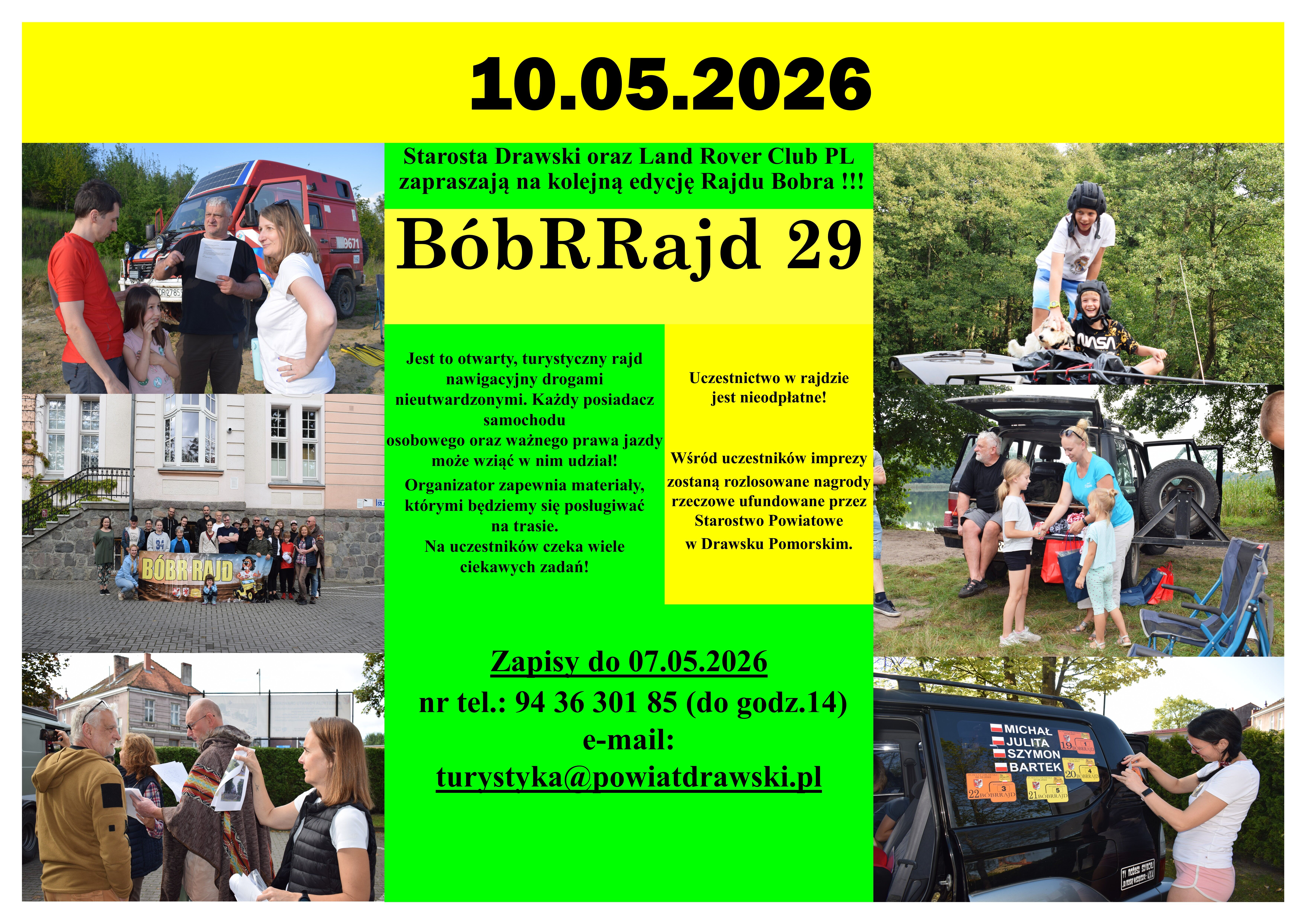 Rajd Bobra to otwarty turystyczny rajd nawigacyjny dla samochodów osobowych (najlepiej z wysokim zawieszeniem), drogami NIEUTWARDZONYMI, organizowany przez Starostwo Powiatowe w Drawsku Pomorskim oraz Land Rover Club PL. Na trasie poruszamy się według roadbook’ów, które zapewnia Organizator. Uczestnictwo w rajdzie jest nieodpłatne. Na uczestników czeka wiele ciekawych zadań: szukanie kodów umieszczonych wzdłuż przebiegu trasy, identyfikacja i lokalizacja na mapach obiektów z fotografii, zadania paramedyczne, zadania sprawnościowe za kółkiem, epizody nawodne.
