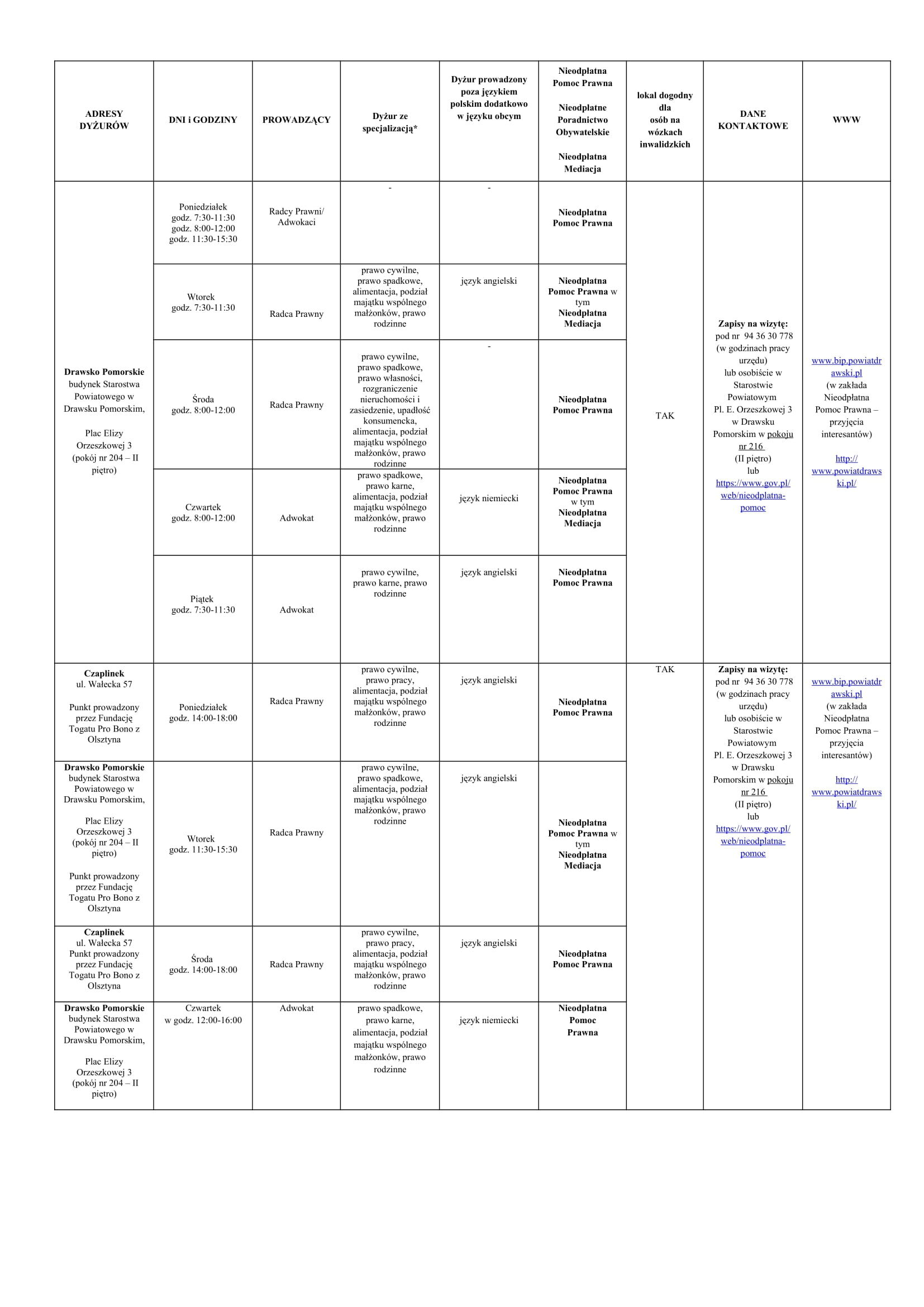 Godziny dyżurów mogą ulec zmianie, wówczas informacja będzie podana na stronie www.bip.powiatdrawski.pl w zakładce Nieodpłatna Pomoc Prawna – Przyjęcia interesantów.